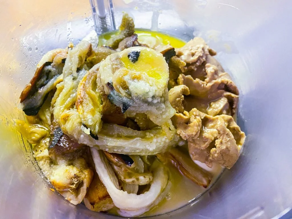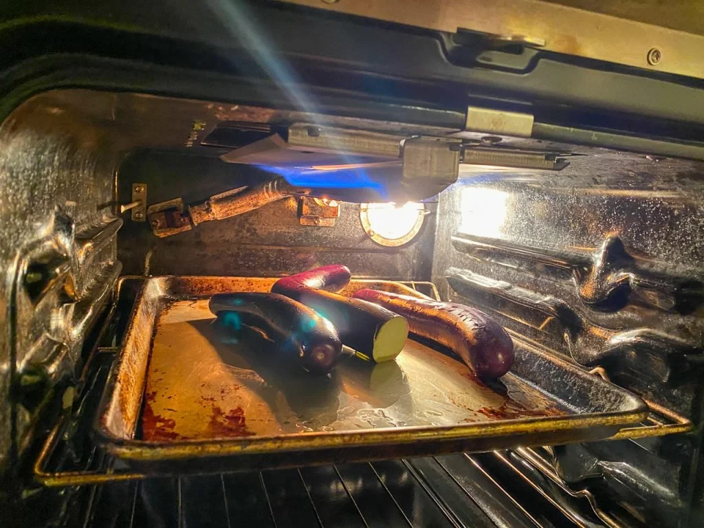 To turn them into baba ganoush, scrape off as much of the skin as you can (though not all of it; the burnt skin adds a smoky flavor), and add the eggplant to a food processor, with a few tablespoons of tahini, a few cloves of garlic, a squeeze of lemon juice, and a good pour of olive oil, plus a big pinch of salt.