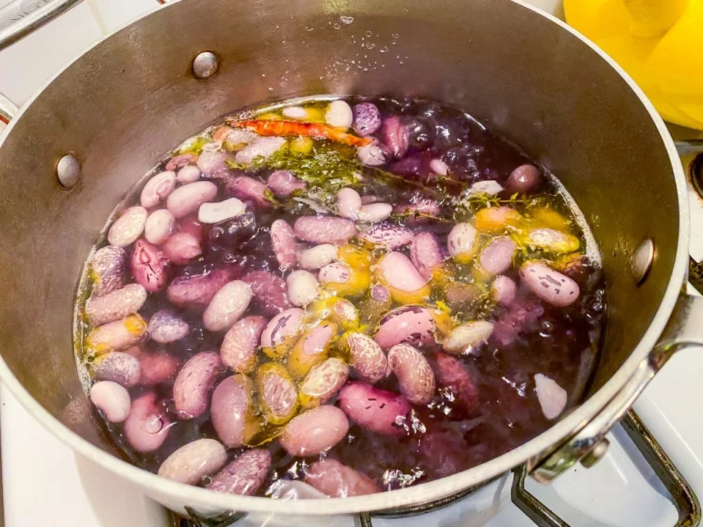 To cook them, I put them in a pot with water, salt, chopped garlic, a few sprigs of thyme, and a dried red chili. I brought to a boil and simmered for 45 minutes, until they were creamy.