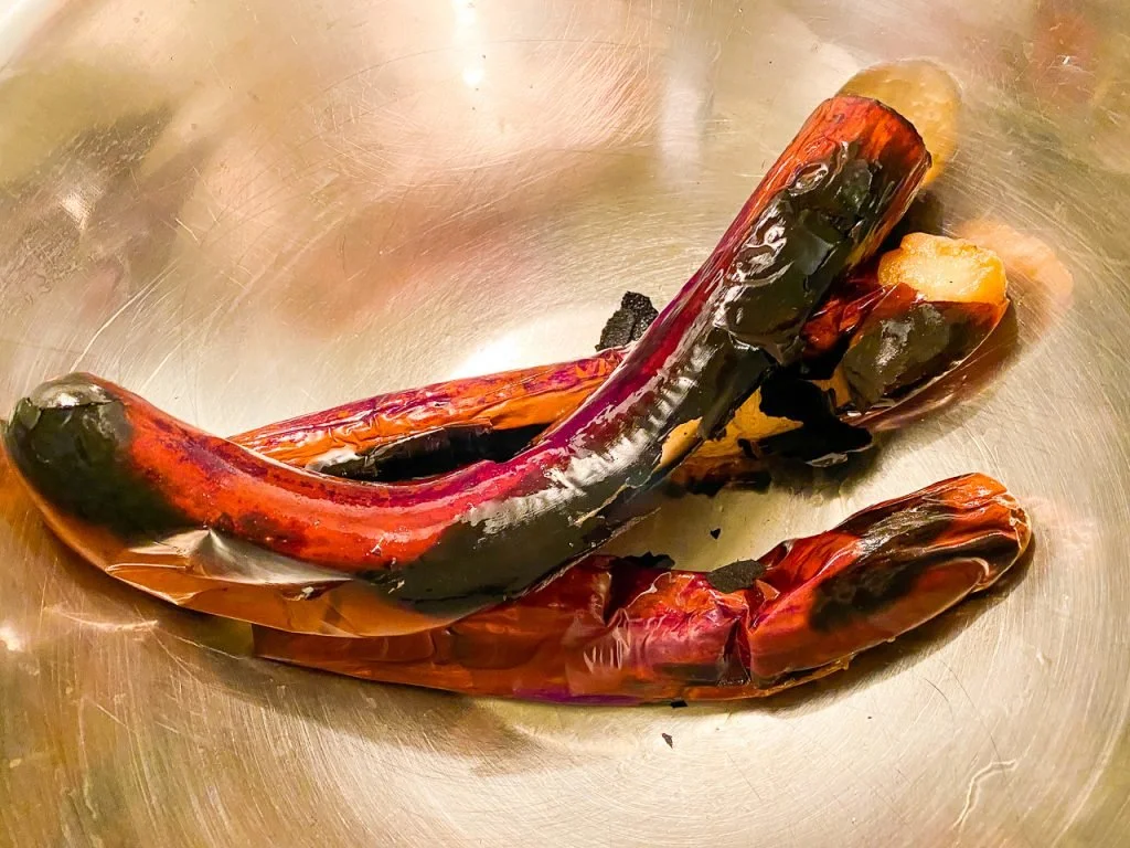 Three Japanese eggplants purchased at the… okay, okay, you know… rubbed with olive oil and placed under the broiler. You want to broil until they’re black all over and squish when squeezed with tongs. Place in a bowl like this, then cover with aluminum foil so they continue to cook.