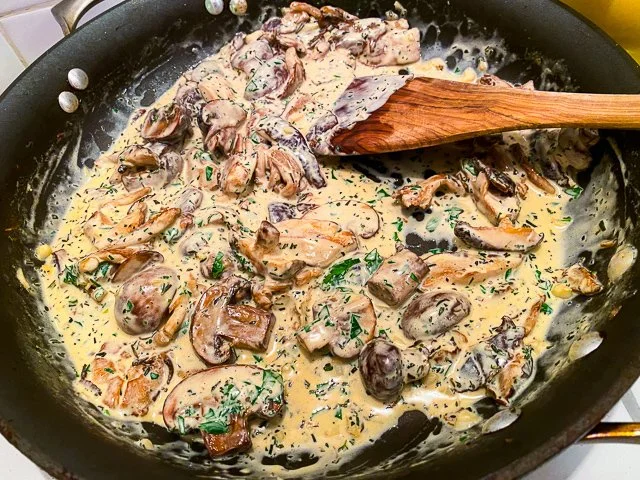 You want to lower the heat when you add the cream, and you want to add enough to fill the pan. Then you just let simmer on low heat until it looks like this.