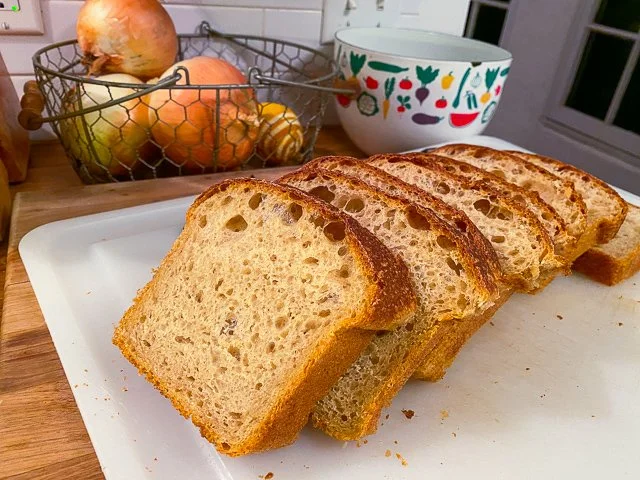 It’s very important, when making toast for dinner, that you do it this way: buy a whole loaf and slice the bread thickly. If you use pre-sliced sandwich bread, you won’t get the same robustness; it won’t feel like dinner, it’ll feel like a diner breakfast. That’s not what we’re going for here.