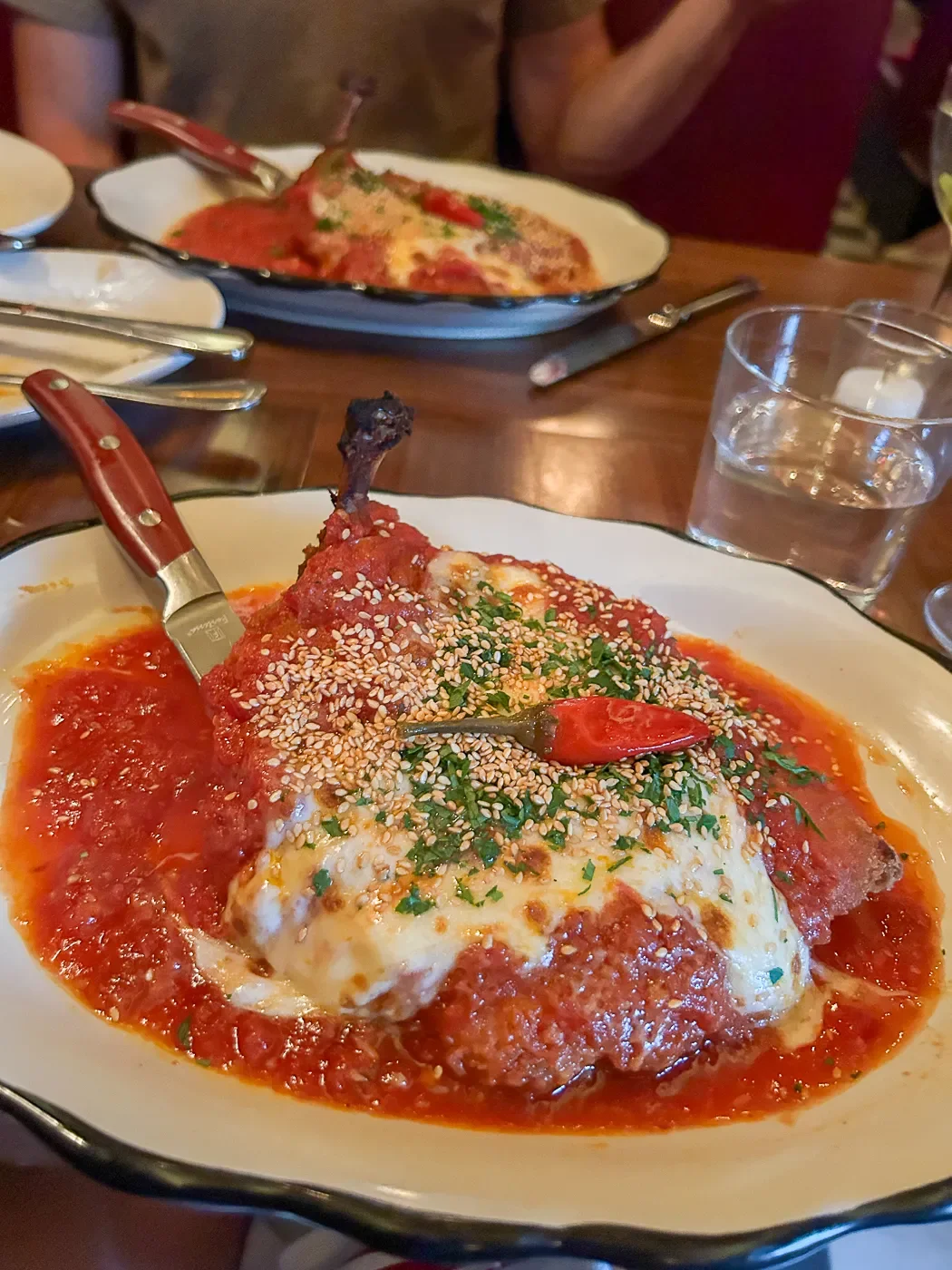 Imagine your favorite Italian-American red sauce joint taken up to an eleven and you’ll get the idea. The garlic bread was dreamy, the salad with arancini (fried rice balls) brilliant, and this chicken parm was epic: