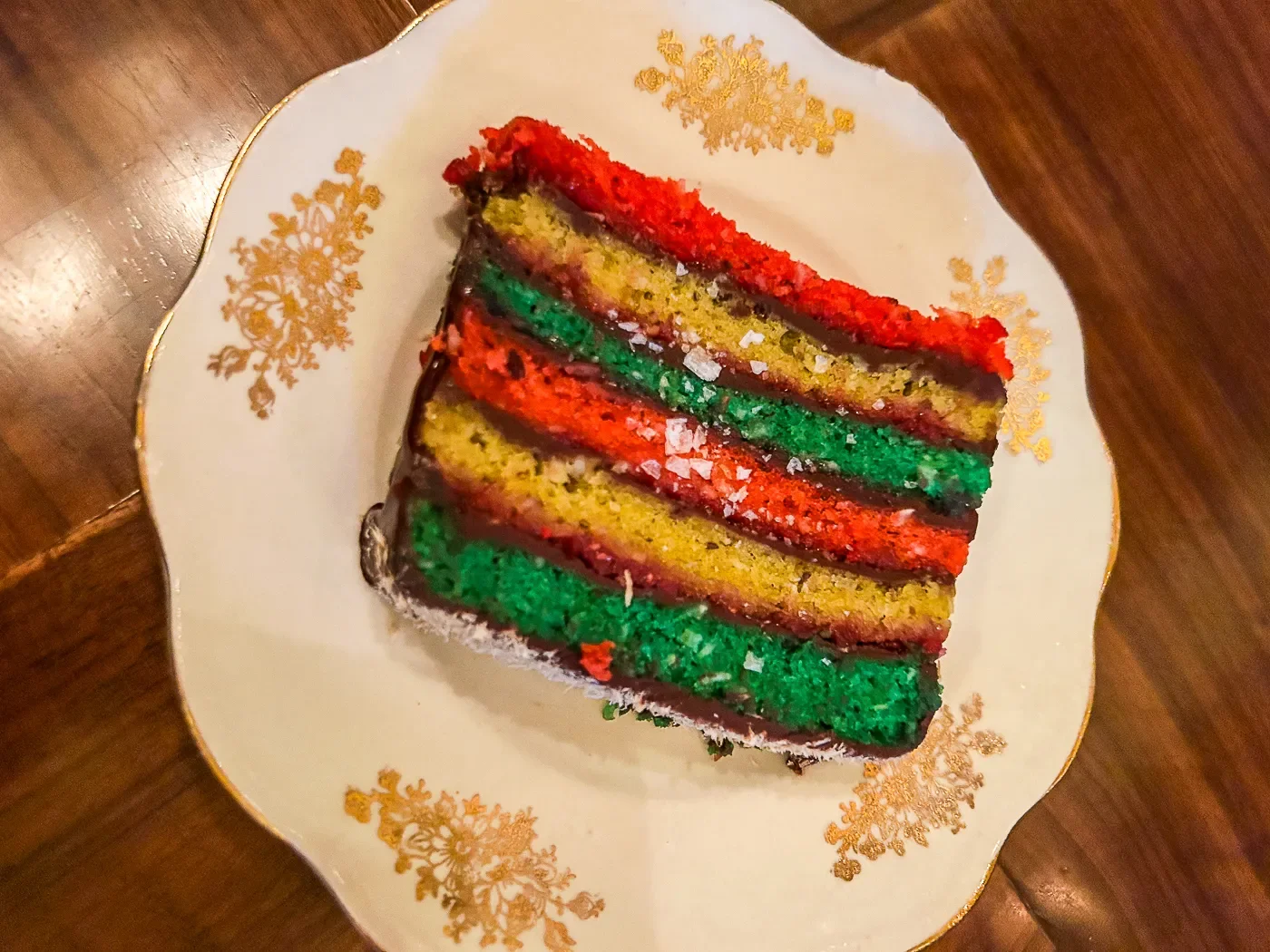 But my favorite dish — and this will come as no surprise to anyone who already knows my favorite cookie — was this rainbow cookie cake: