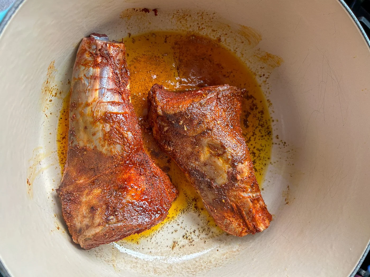 Into the fridge they go (and those are some meaty one pound lamb shanks) and the next day, when you’re ready to cook, you heat oil in a Dutch Oven and start to brown them. Careful! You don’t want to burn the spices. If the spices do burn, be sure to wipe them out with a paper towel before moving on to the next step, or you’ll have a very bitter braise.