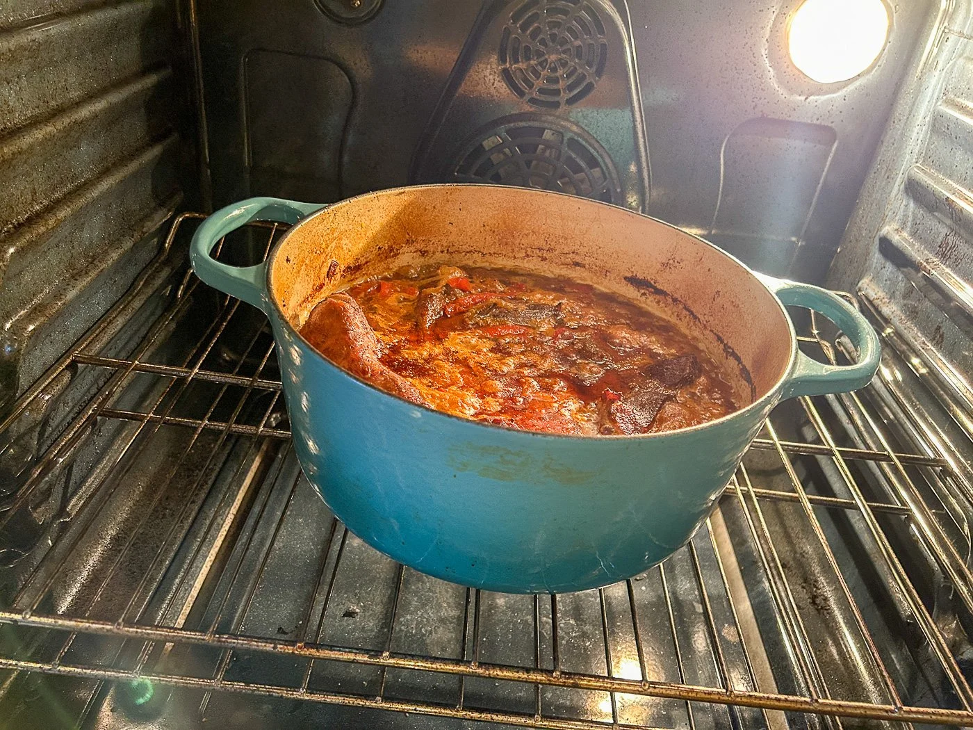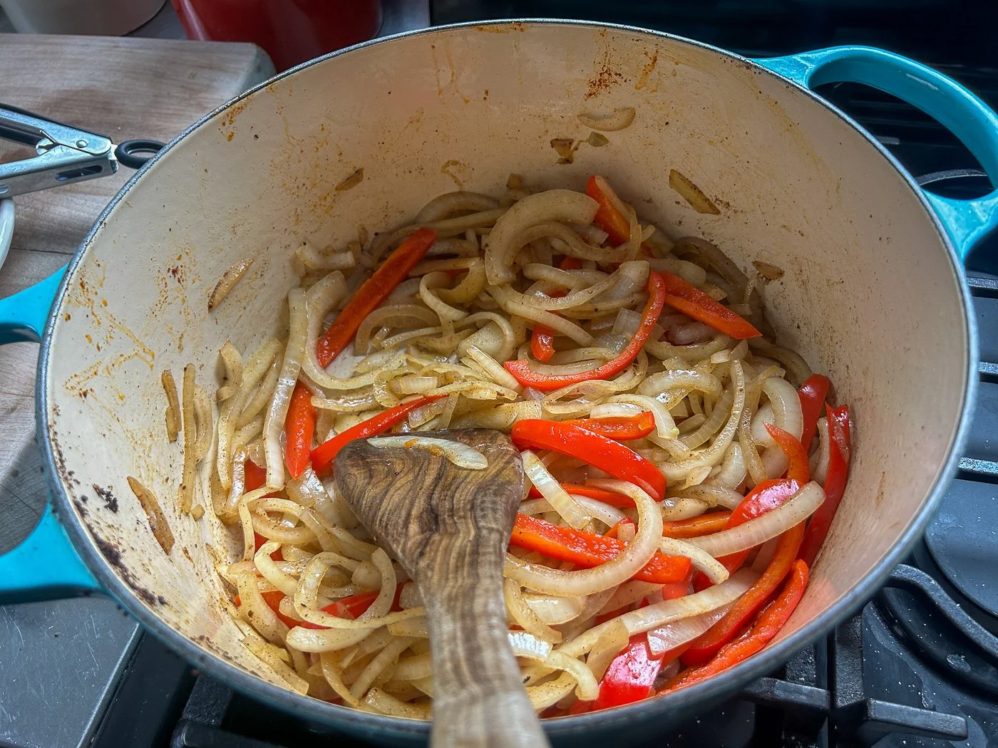 I don’t have an exhaust vent in my new kitchen, so I had all of the windows open on a 30 degree day to keep the smoke alarms from going off. The things I do for my dog! (The noise makes him quiver.) Once the meat is all browned, you add your aromatics: in this case, onions and red peppers.