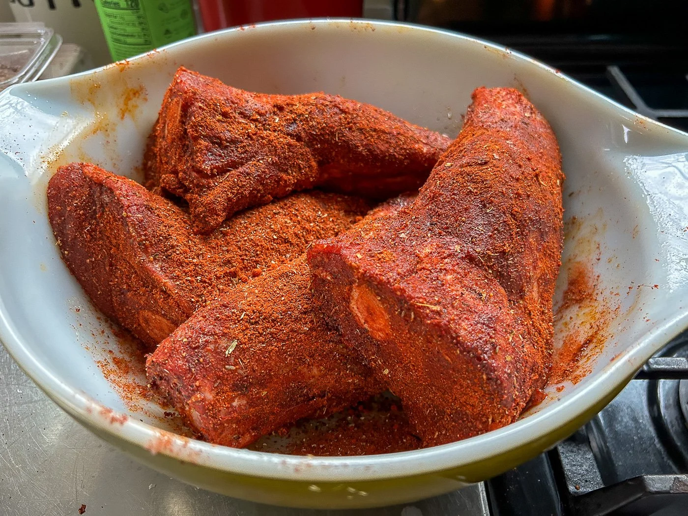 This is one of those recipes where you want to season the meat the day before, which I actually find pleasurable because: (a) you get part of the recipe over with; and (b) seasoning the meat ahead really does work magic, especially when it comes to the salt. Here you’re working with a mix of cardamom, black peppercorns, white peppercorns, whole allspice, whole cloves, sweet papika, cumin seeds, coriander seeds, cinnamon sticks, cayenne pepper, and a bay leaf that you grind up in a spice grinder. Got all that? Then you rub lamb shanks with olive oil and coat in the spice, along with salt.
