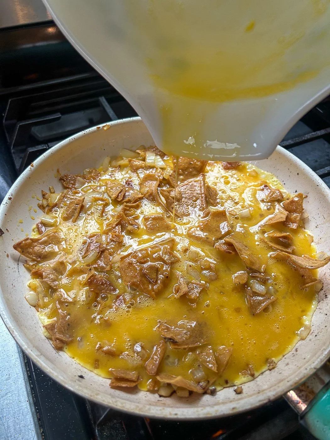 Call me a kook, but there’s something soothing and fun about stirring chips around a pan of hot oil. When they’re good and coated and maybe even starting to color, you add an onion, a chili if you have one (I didn’t), and, finally, your eggs.
