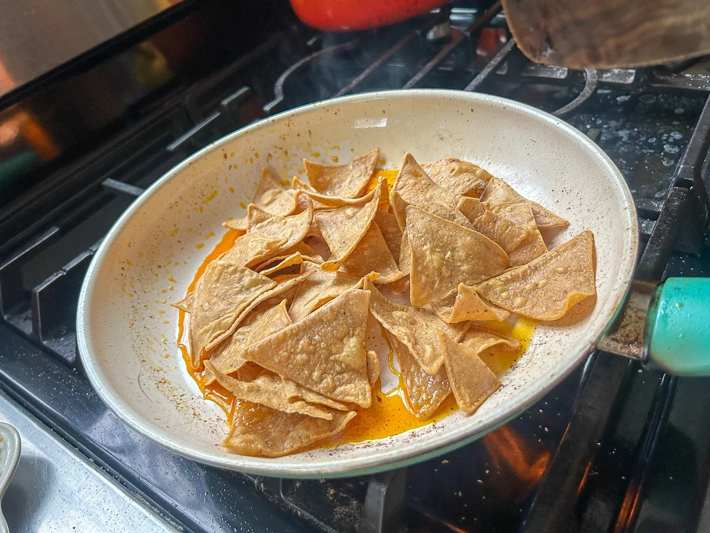 Add the tortilla chips to the hot oil and use a heatproof rubber spatula to move them around, and break them up a little. When they’re good and hot and starting to color, add the onion and the jalapeno (if you’re using it). Stir and cook just until the onion and jalapeno are soft.