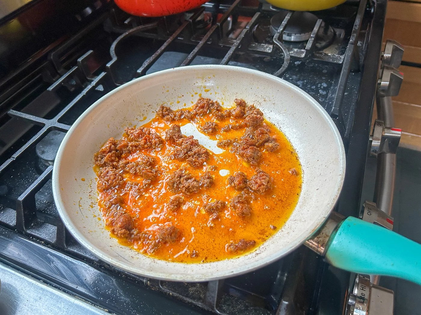 In a non-stick skillet or a well-seasoned cast-iron skillet, add a splash of oil and crumble in your raw chorizo. Turn up the heat to medium-high and cook until the chorizo is crispy and dark brown and the oil is tinted red. Carefully remove the cooked chorizo to a plate.