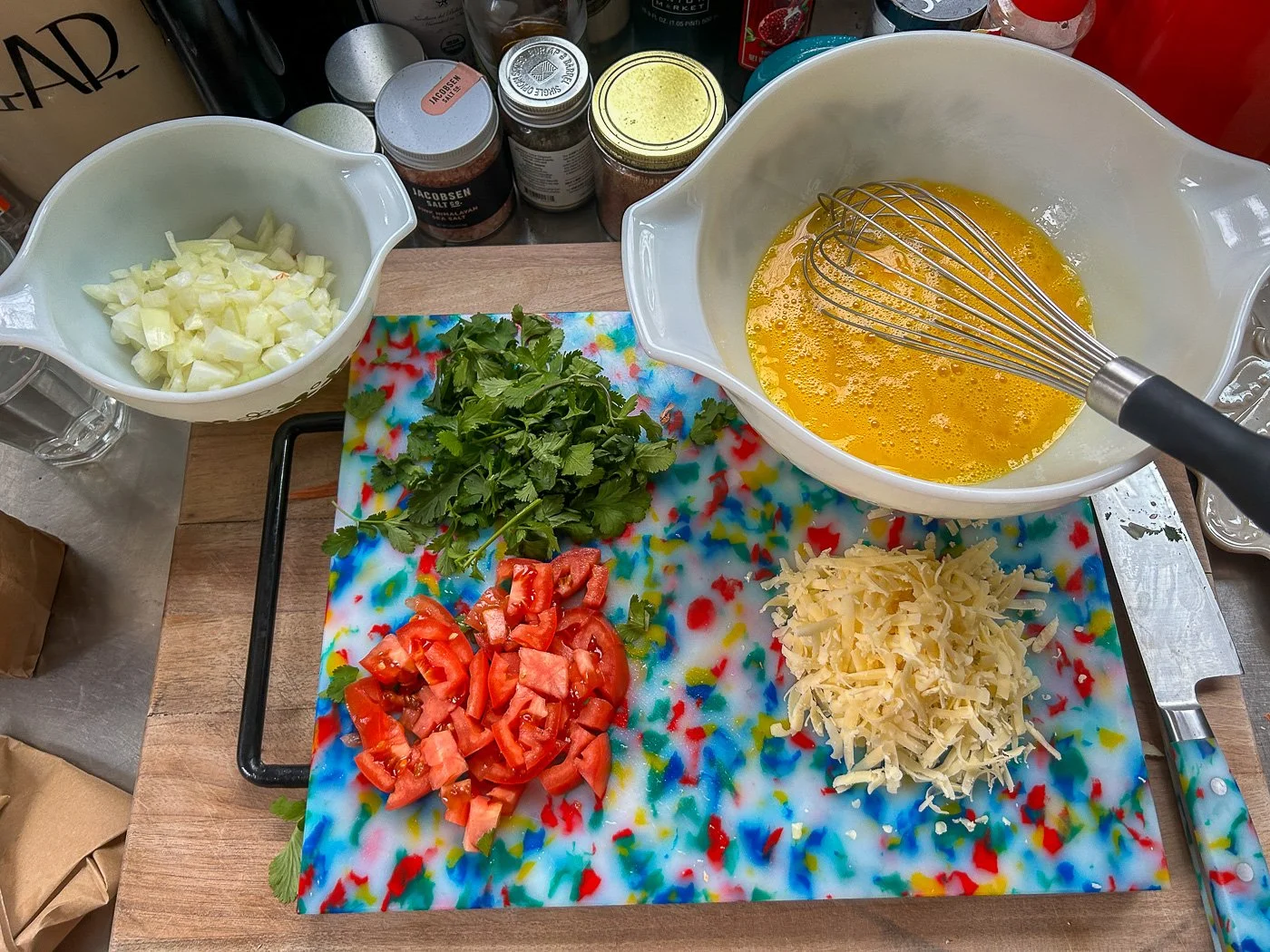 This part happens fast: use a heatproof rubber spatula to move everything around, just until the eggs are starting to set. Then add grated cheese (I went for sharp white cheddar), a diced tomato, and cilantro.