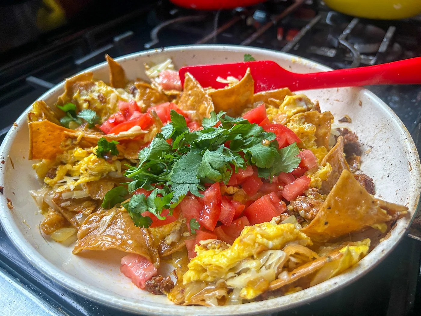 Add the chorizo back, then the eggs and quickly move them around with the tortilla chips as they start to set. Don’t overcook — turn off the heat as soon as the last big of raw egg sets. Stir in the cheese, tomato, and cilantro, saving a little of each to garnish. Serve right away with warm tortillas or just a fork. Or both!