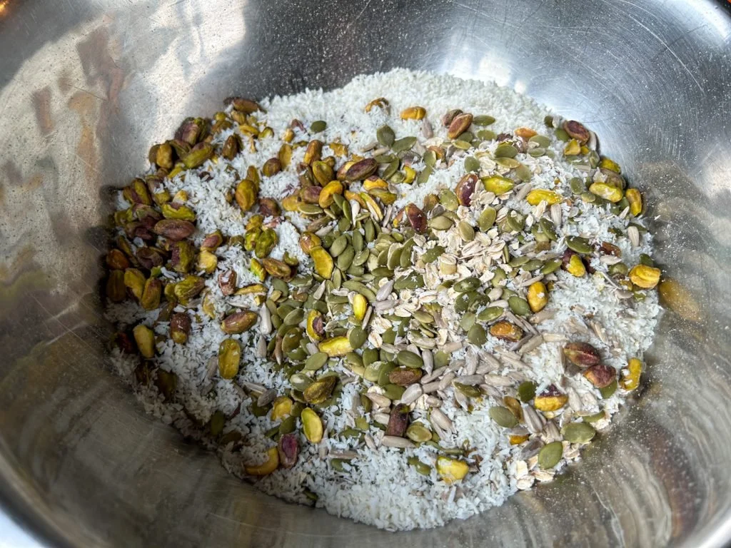 In terms of ingredients, it has all the delectableness of pistachios and coconut mashed up with the good-for-you-ness of chia seeds, sunflower seeds, and pumpkin seeds. And there are enough old-fashioned rolled oats in here to please any Quaker.