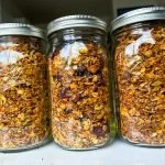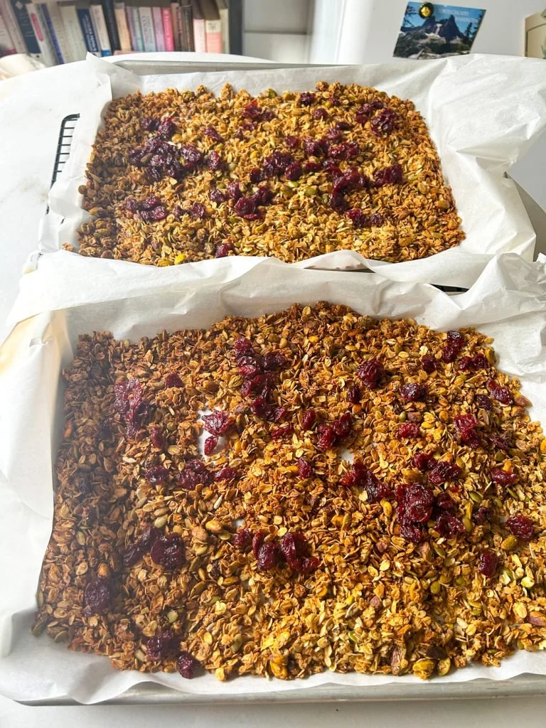 The original recipe — which I’ll include here — calls for molasses which I thought I had, but turns out I didn’t. So I just added more honey along with the maple syrup. Those two things — honey and syrup — are applied delicately. The finished granola isn’t too sweet; it’s just sweet enough.