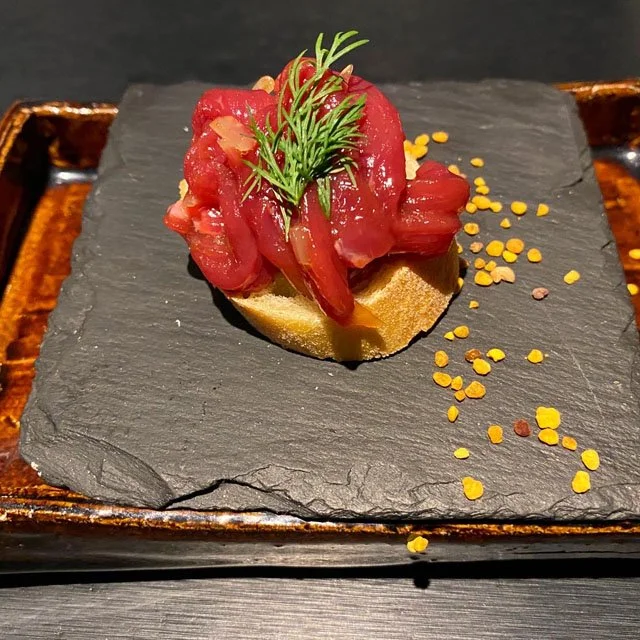 Immediately upon sitting down, the chef — who’s in the previous picture and who grilled all of our food expertly and methodically over charcoal — asked us if we ate raw poultry. Coming from America, where I’m so squeamish about salmonella I marinate my chicken in Chlorox (Jk! don’t try that), we were nervous. But then he served us this ostrich tartare, which was beautiful to look at, as well as to eat.
