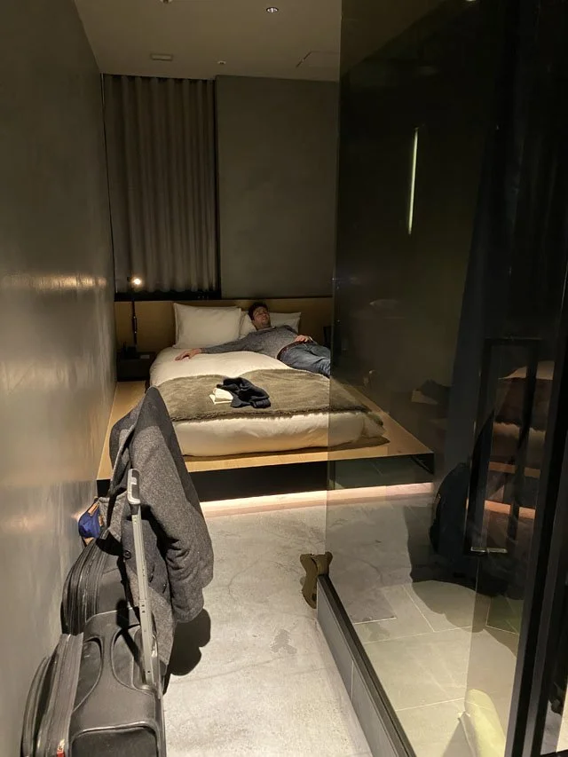 The Hotel Koe, on the other hand, seemed bright and fun. There was a clothing store and a restaurant in the lobby and it seemed to be close to all the trains; plus the price was super reasonable (I want to say only $300 a night.) Only catch? Our room was going to be comically small. People left comments on the web about how small the room was. So I prepared Craig beforehand and this is what our room looked like: