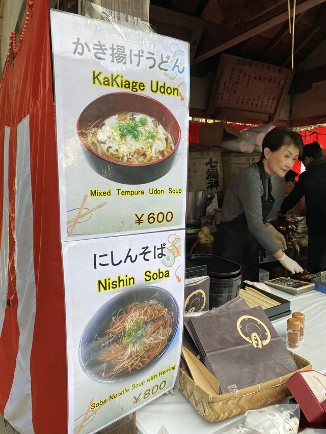 Kyoto was positively humming with activity when we were there because of the New Year. There were all kinds of festivals going on around the temples with lots of food to sample. When we walked The Philosopher’s Path — an essential hike between two temples — we found a huge line of people waiting to say their prayers at the temple, and near it a woman serving cold soba noodles with smoked fish (it’s the lead picture in this post).
