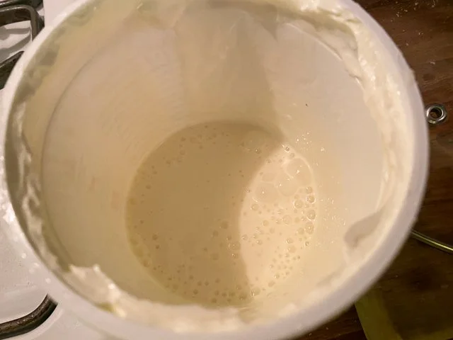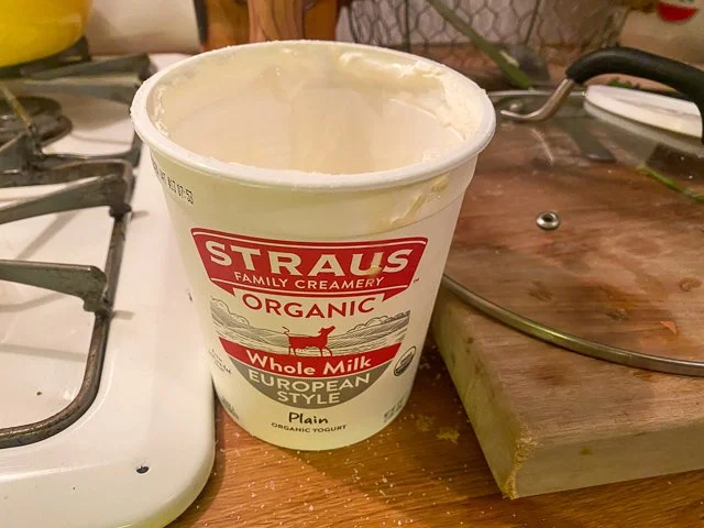 Here’s how you start: look inside your mostly-empty yogurt container. This one had about 1/2 cup to a cup of yogurt. To that, I added milk and stirred it in. Let’s say I added 1/2 cup of milk. Then I add a pinch of salt and I start sweetening it with maple syrup (you could also use honey).