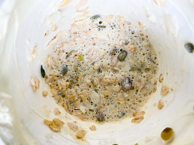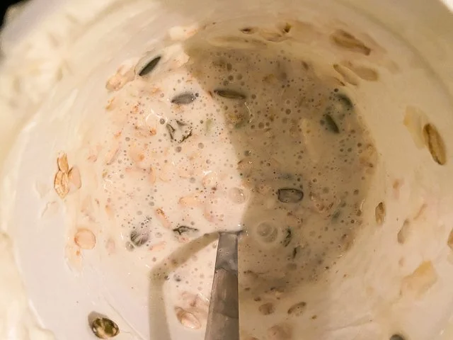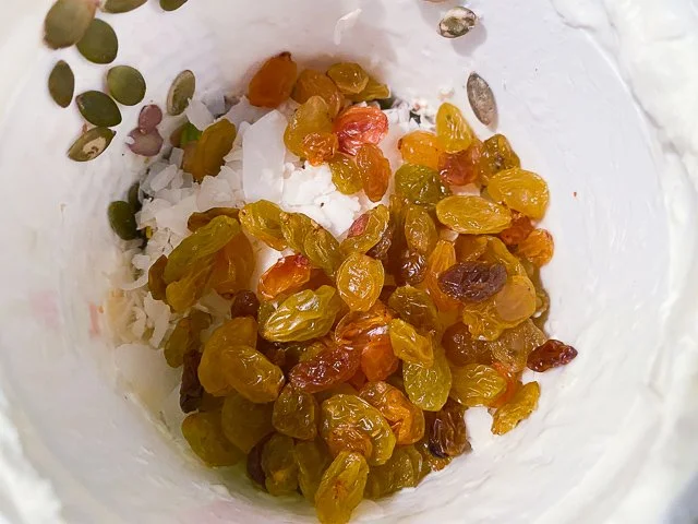 But here’s the thing: you really can’t screw this up. As long as you like the taste, the next step is adding the dry stuff. So start with less dry stuff: add old-fashioned rolled oats (start with 1/2 cup) and then play around. I like to add pistachios, unsweetened flaked coconut, golden raisins, and pumpkin seeds.