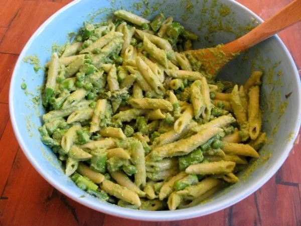 Now, it’s just a matter of stirring it all together. Add your pasta to the bowl with the asparagus and peas, pour the pesto on top (I used all of it) and stir it up: