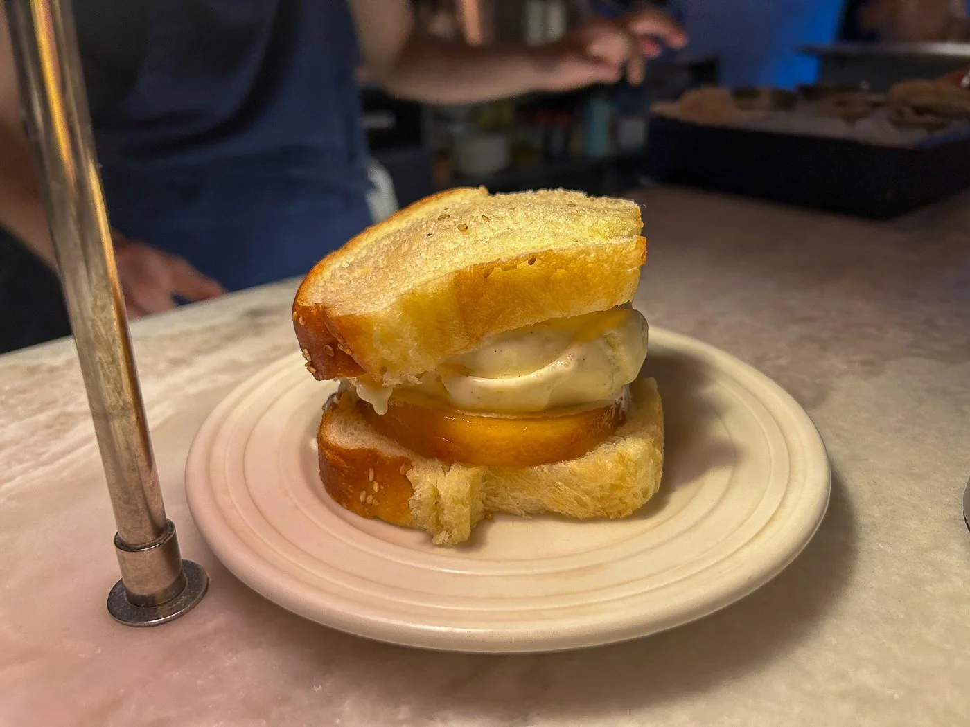 The desserts were wild too. Loved the chocolate mousse with vanilla oil; but the ice cream sandwich with peach ice cream served on brioche was out-of-this-world.