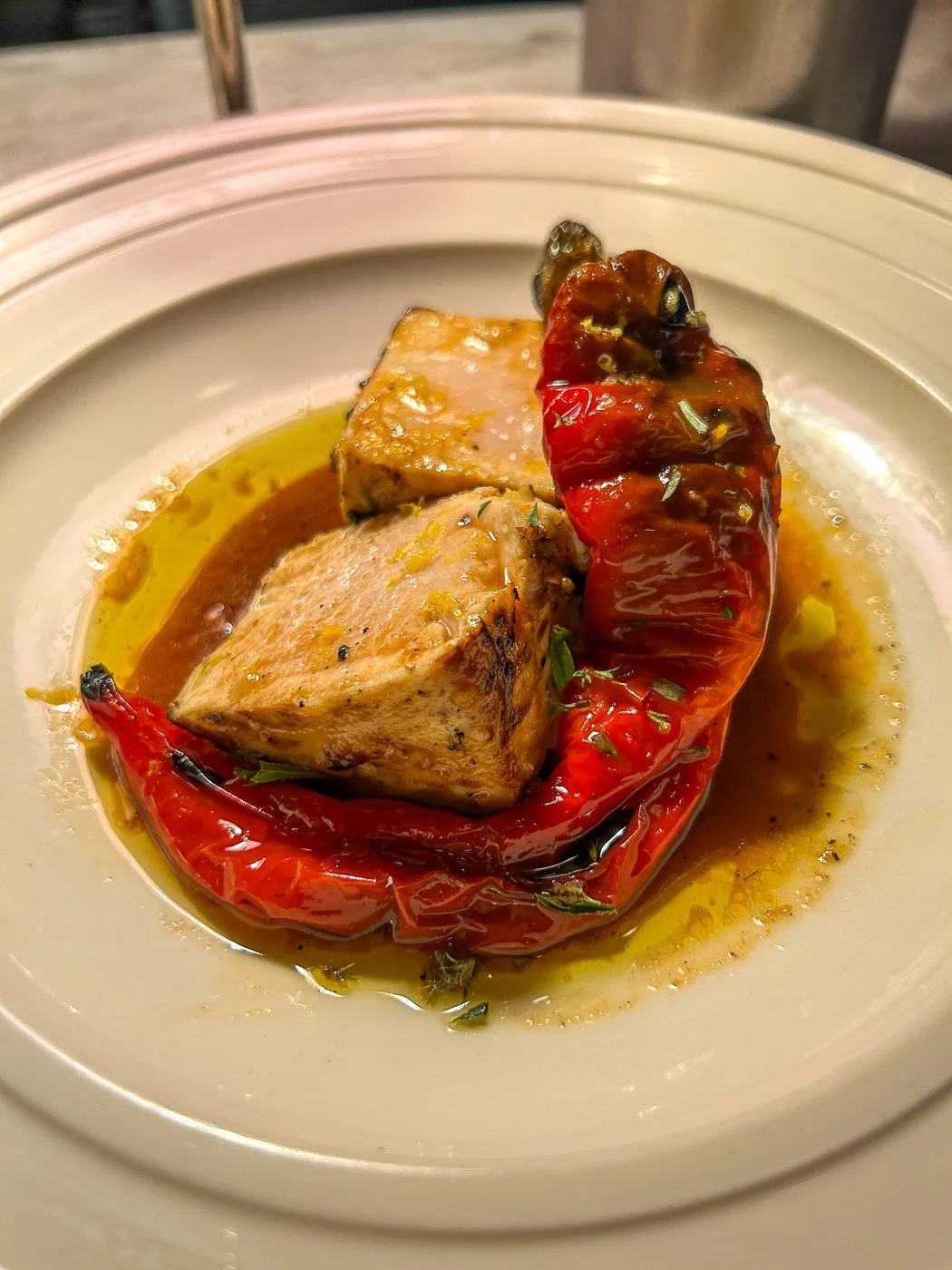 And swordfish wrapped in pork fat before being grilled and served with Jimmy Nardello peppers.