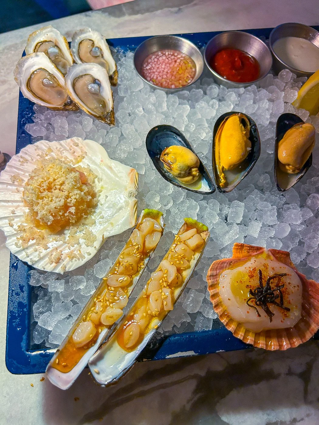 This is only half of their Ice Box+, which comes with razor clams, a live scallop (I think that just means they open it up fresh), pickled mussels, fresh oysters, and clams.