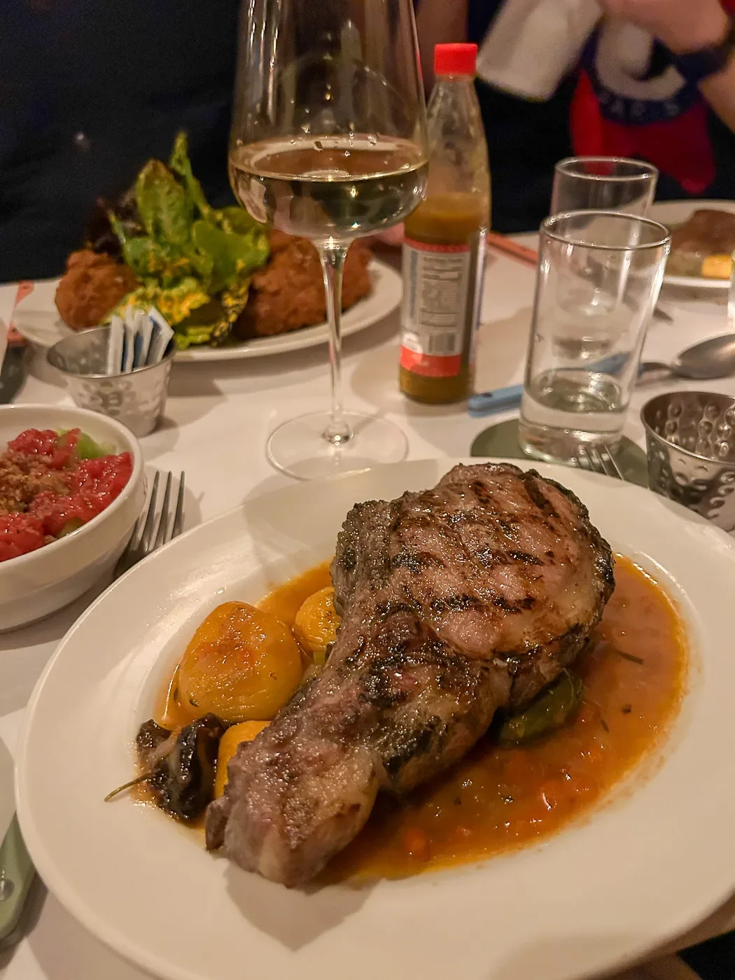 For my entree, I ordered a pork chop with “Pitt’s sauce” which was kind of sweet and sour and a good foil to the meat which also came with apricots and olives.