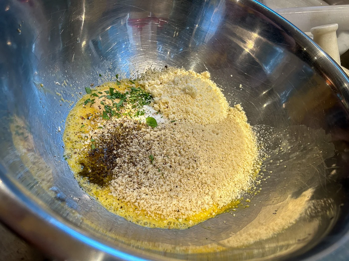 Then all I had to do was make the meatballs. The recipe that I used was pure genius: Chris Morocco’s Tuesday Night Meatballs. Here’s how easy: preheat the oven to 425 and then, in a large bowl mix together 2 large eggs, 1 1/2 cups panko, 1/2 cup whole milk, 1 1/2 teaspoons Diamond Crystal salt, 1 teaspoon garlic powder, 1 teaspoon oregano (I used marjoram that I’m growing), 1/2 cup of freshly grated Parmesan, 3 tablespoons of olive oil, and a grinding of pepper.
