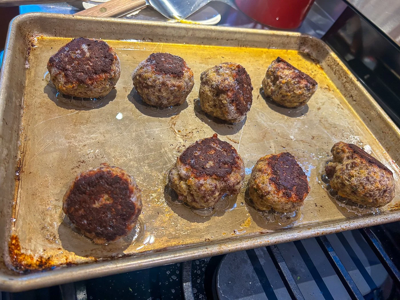 That makes a paste and then you let it sit for ten minutes. Then you take a pound of ground beef and work it in. I used my hands. Shape the meat into 8 balls and brush olive oil on to a cookie sheet. Put the balls on the sheet and pop into the oven. In fifteen minutes, the balls will be crisp and golden brown on the bottom. Flip them over with a metal spatula.