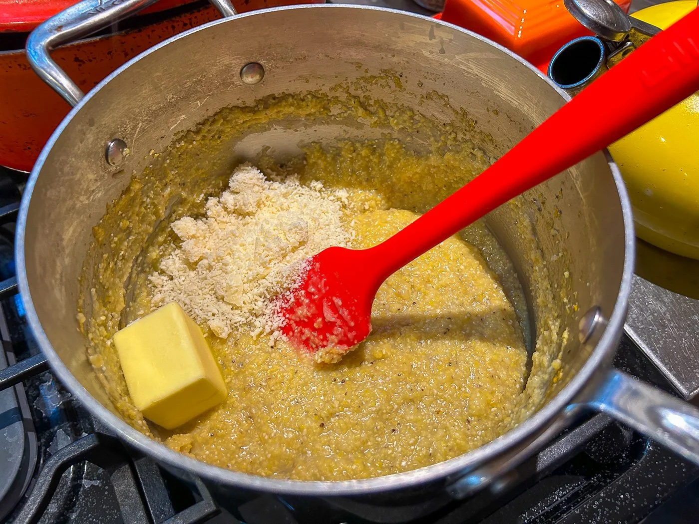 The rest I took my time with just because I like to. So I made polenta the old-fashioned way: by taking stone-ground polenta (not instant), whisking it into 5 cups of boiling stock, continuing to whisk while it bubbled away until it was thick. Then I lowered the heat, covered, and stirred every 5 minutes or so for an hour until it was super thick and creamy. Then I doctored it with butter and Parmesan, as one does.