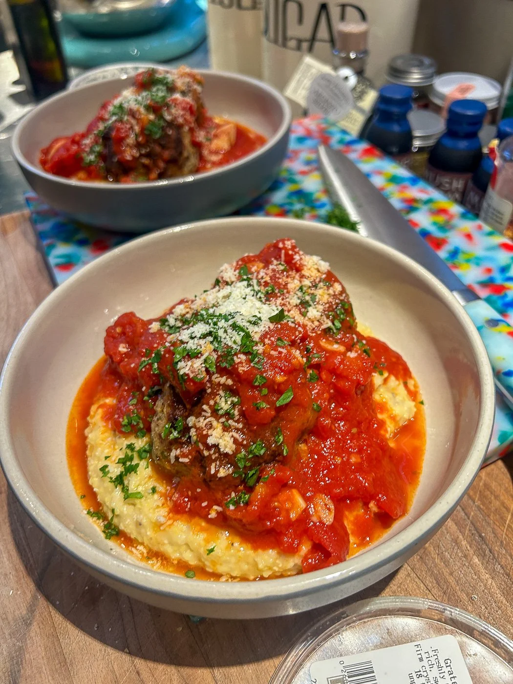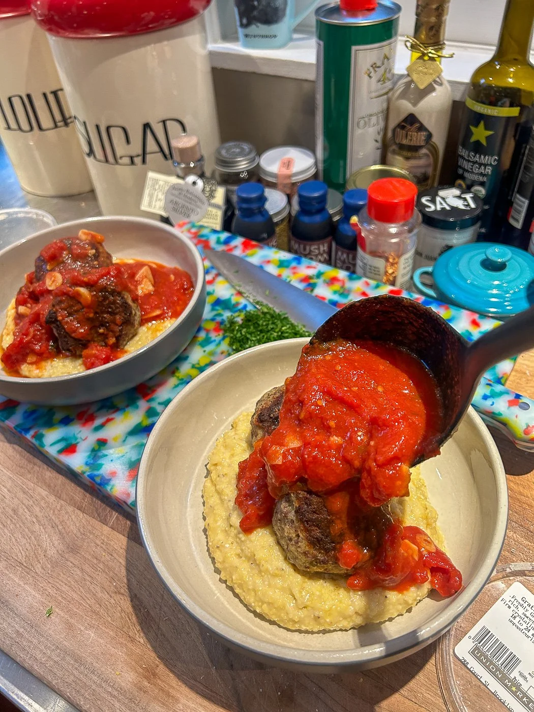 It’s such a cozy dinner, even as it gets warmer outside. And you don’t have to do the slow-cooked polenta. You could just bake the meatballs in the oven, use store-bought marinara, and put ‘em on spaghetti, put ‘em in a hero, or just eat them by themselves. These balls are a winner, baby.