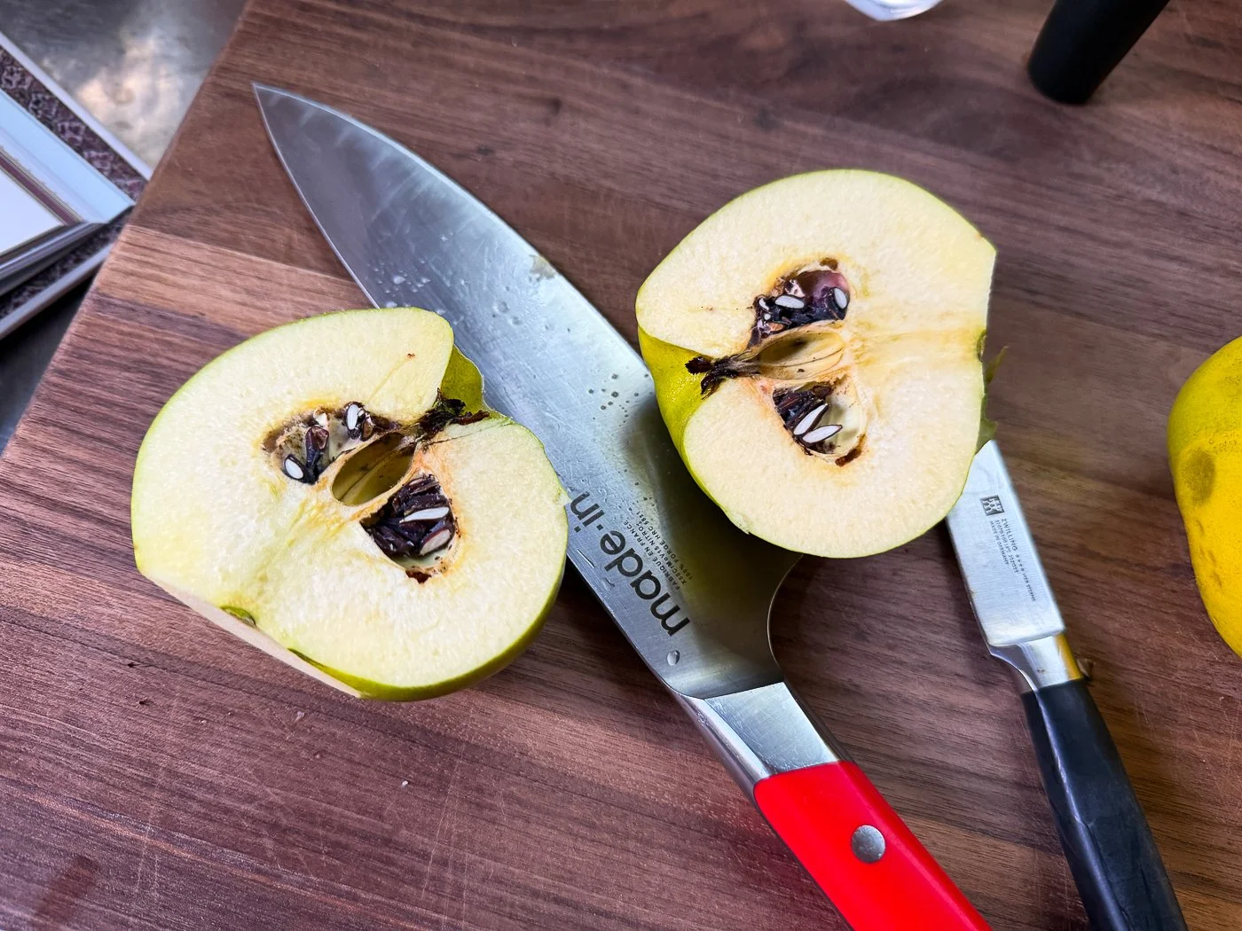 As for prepping the quince, you just cut it in half (Homa has you leave the skin on) and cut out the seeds and tough interior. (I started with a paring knife, but a spoon worked better.)
