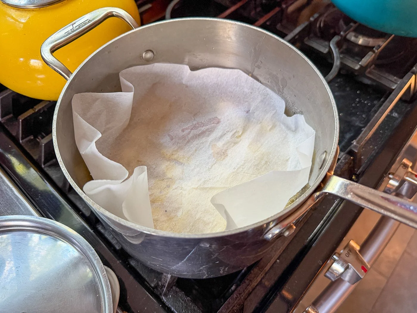 Then the magic begins. You bring to a boil, lower to a simmer, and cook for at least ninety minutes, or longer if necessary. I made a little parchment paper hat to keep the quince submerged.