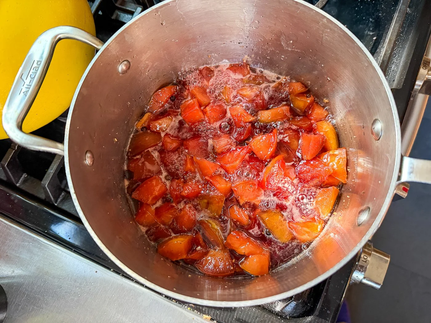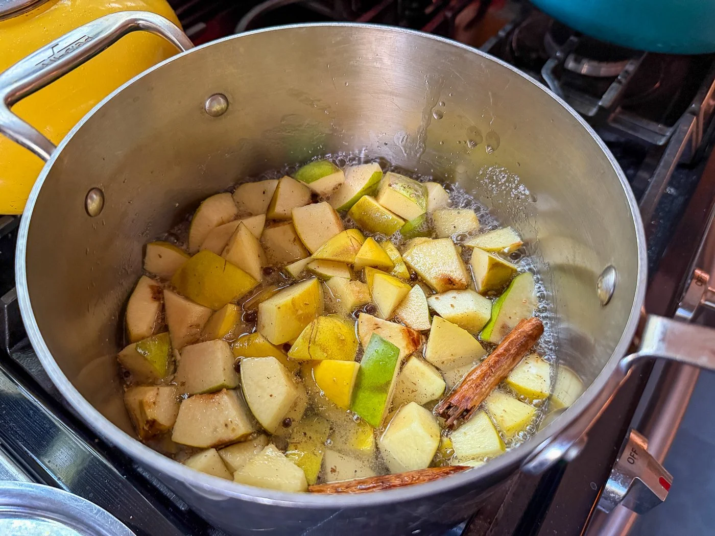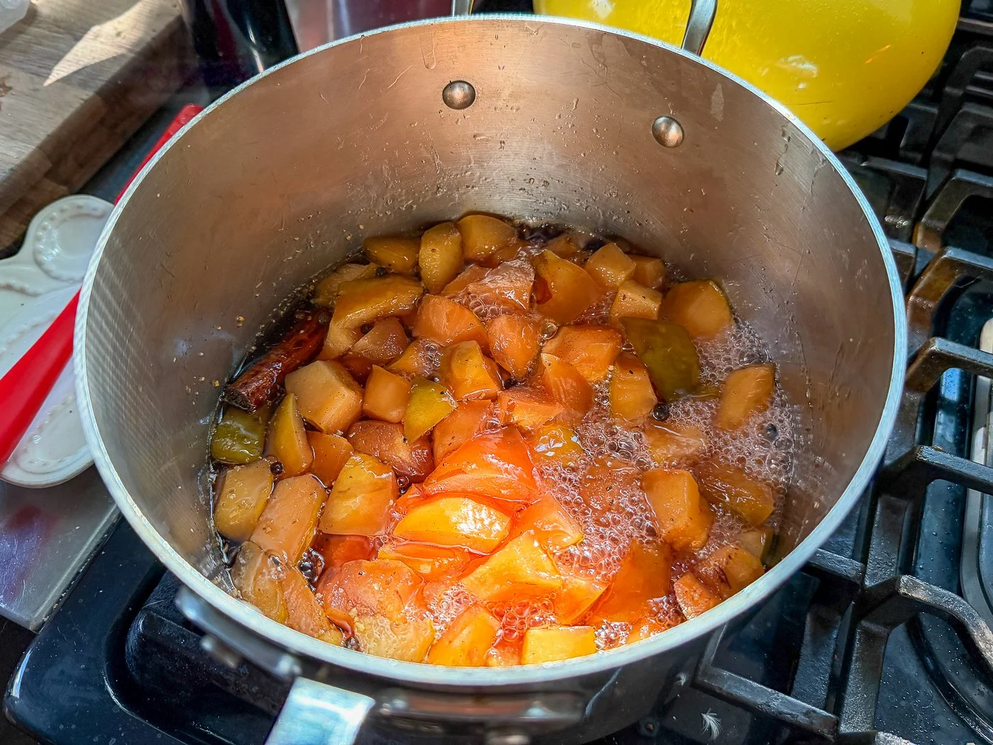 Then you cube the quince and add it to a pot with the sugar and water. At this point, Homa has you add crushed cardamom pods, but I went with a cinnamon stick, whole Allspice berries, vanilla bean paste, and cardamom powder because that’s what I had.