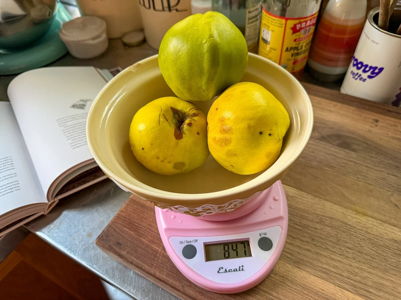 Using a recipe from Homa Dashtaki’s wonderful book, Yogurt & Whey, I started out by weighing the three quince that I brought home.