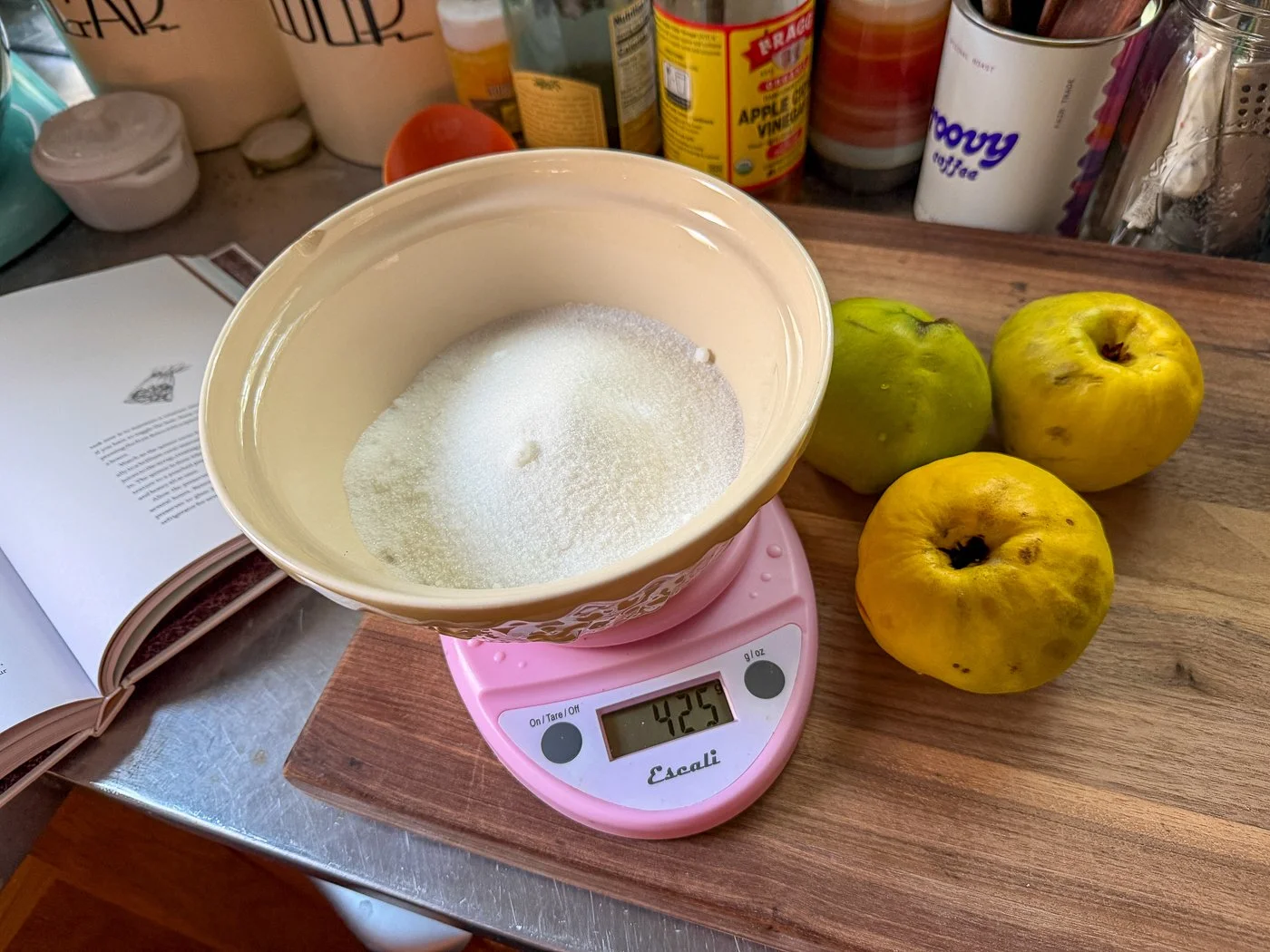 It’s a really simple ratio: whatever your quince weighs, you use half the amount of sugar.