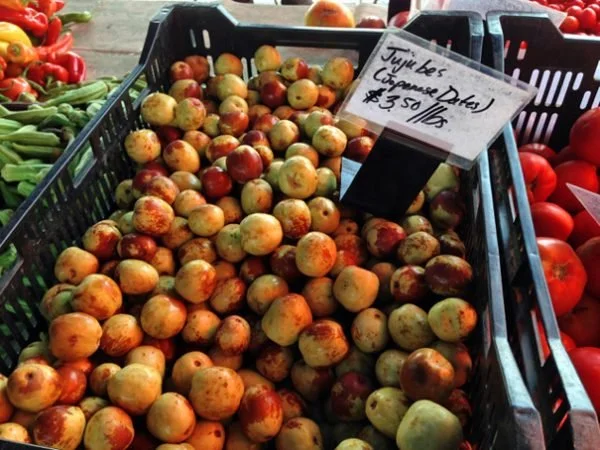 So at the Hollywood Farmer’s Market, where I bought the ingredients to make my soul-stirring Summer’s End pasta, I spied an unusual sight–something I’d never seen before: a crate of Jujubes, identified as “Japanese Dates.” Jujubes are a real thing? A fruit? Not just a movie theater candy? I was intrigued. So I filled a small bag with them and brought them home. First, though, I paid. I’m not a crook.