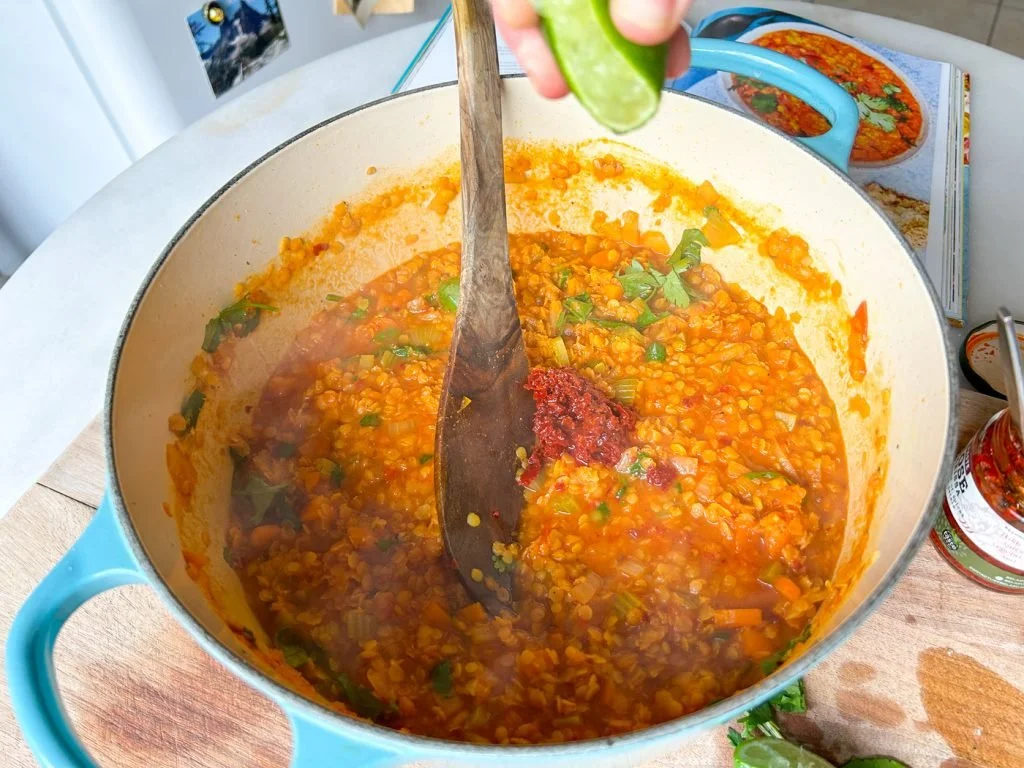 It’s worth seeking out red lentils here: they’re softer and less intense than their green and brown cousins.