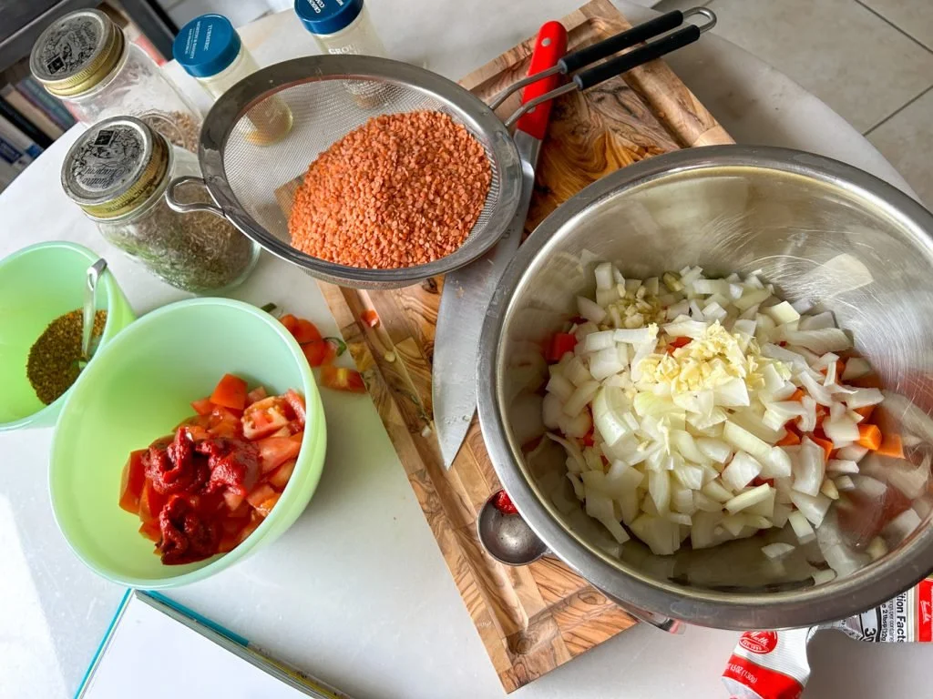 So the next time you look out your window and see wet stuff, make red lentil soup with harissa. This is as seasonal as it gets.