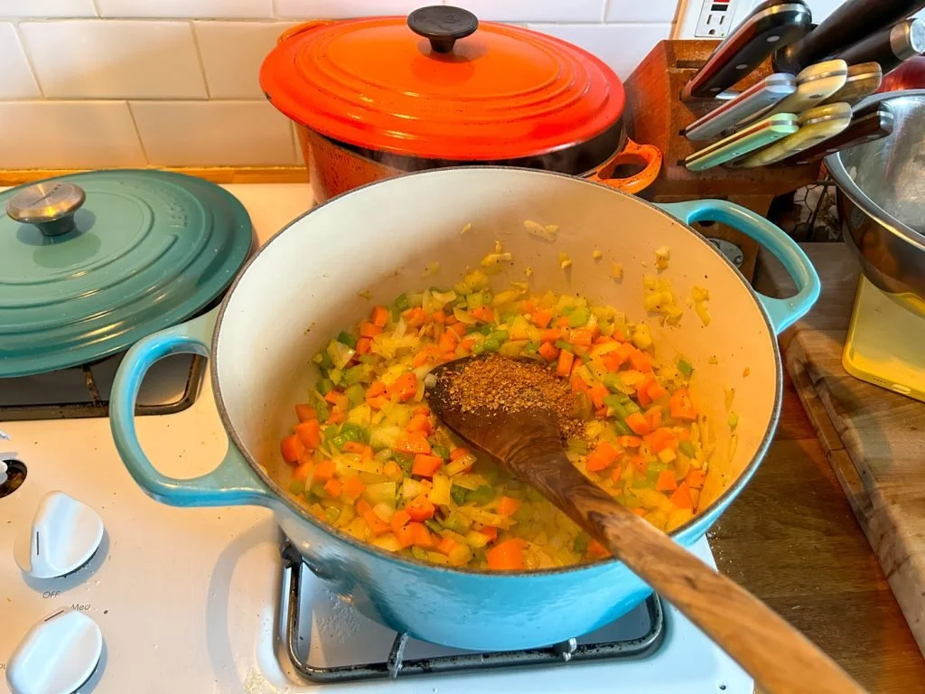 In a medium Dutch oven or pot, heat 3 tablespoons of the olive oil over medium-high heat until shimmering. Add the onion, garlic, carrots, and celery and season with a big pinch of salt and black pepper. Reduce the heat to medium and cook the vegetables for 5 to 7 minutes, tossing regularly until they soften.