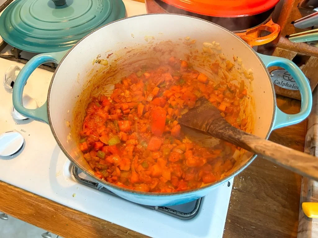 Add the coriander, cumin, and turmeric to the pot and stir to coat the vegetables. Stir in the tomatoes and tomato paste and cook for another 5 minutes over medium heat, then add the lentils, vegetable stock, and water.