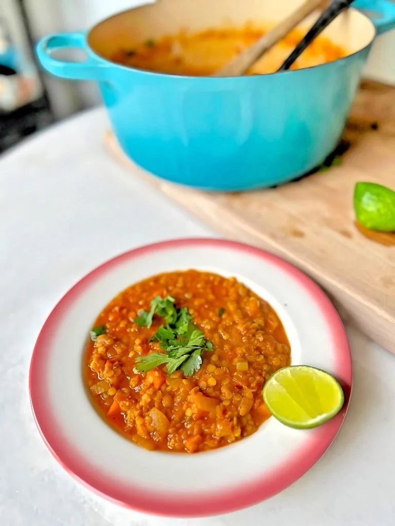 Raise the heat to medium high and bring to a boil, then boil for 5 minutes. Turn the heat to medium-low, cover partially with the lid, and simmer for 20 to 25 minutes, until the lentils are tender and creamy. Check occasionally and add a little more stock or water if the soup gets too thick for your liking.