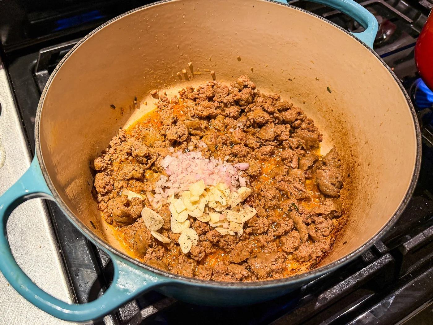 Freshly grated nutmeg is one of my favorite spices of all-time (I’m still in mourning for The Barefoot Contessa who insists on using the pre-ground stuff). It’s great in a baked good, but even more delightful in a meaty ragu. This one starts with sausage that you brown really well before adding shallots, garlic, and the aforementioned nutmeg.
