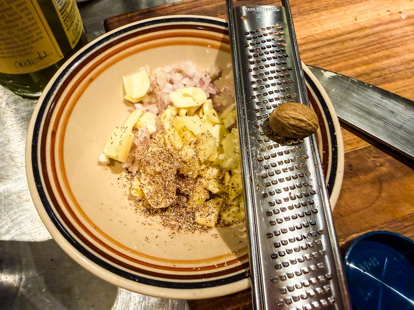 - Reduce the heat to medium and add the garlic, shallots, and nutmeg. Cook, stirring occasionally, until the shallots are translucent and the garlic is soft, 3 to 4 minutes.