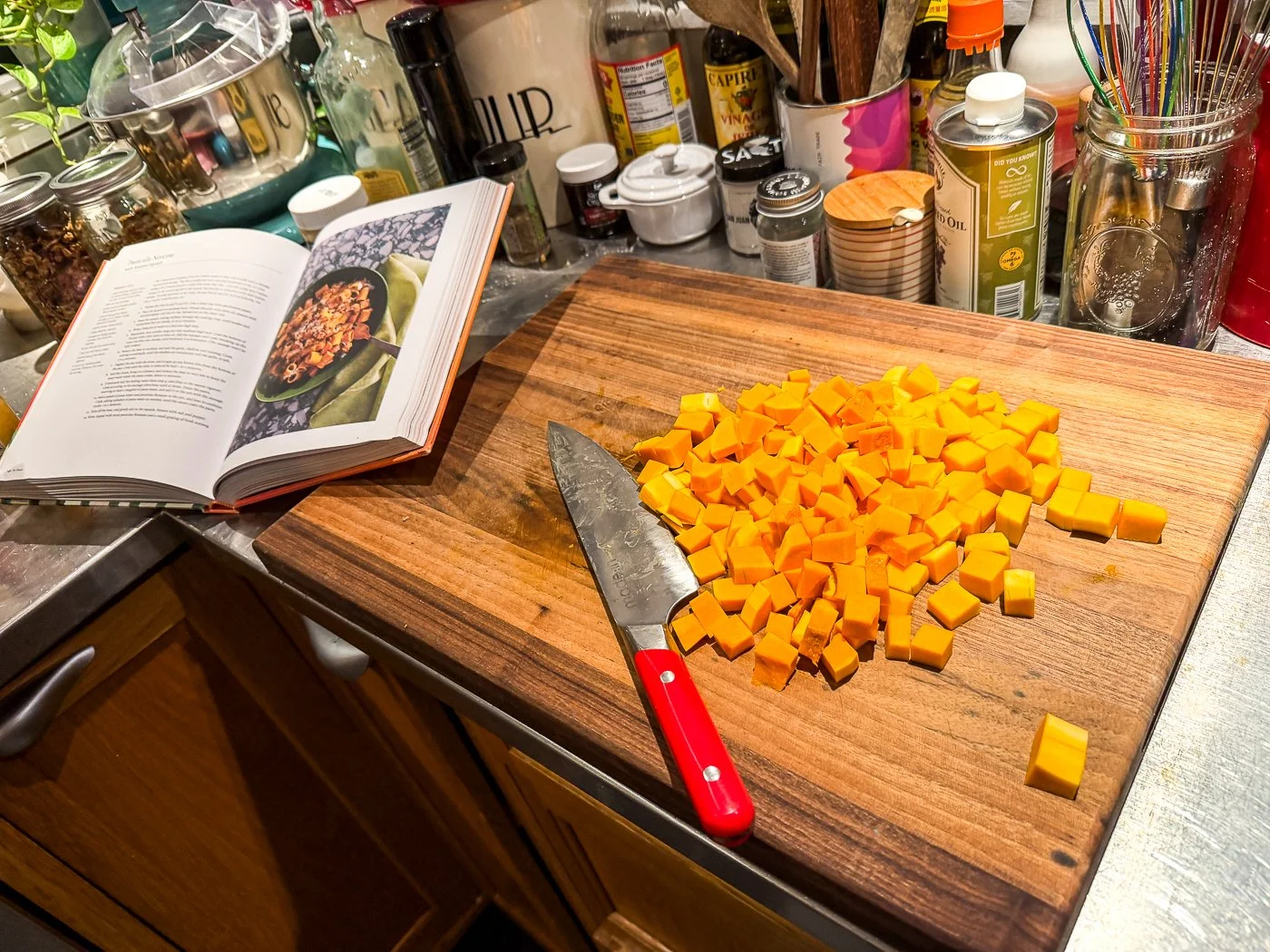 Once that cooks down, you could stop, add the pasta, and call it dinner. But Hailee has you go one step further and add squash: a diced butternut squash that you roast at 425 until golden brown.