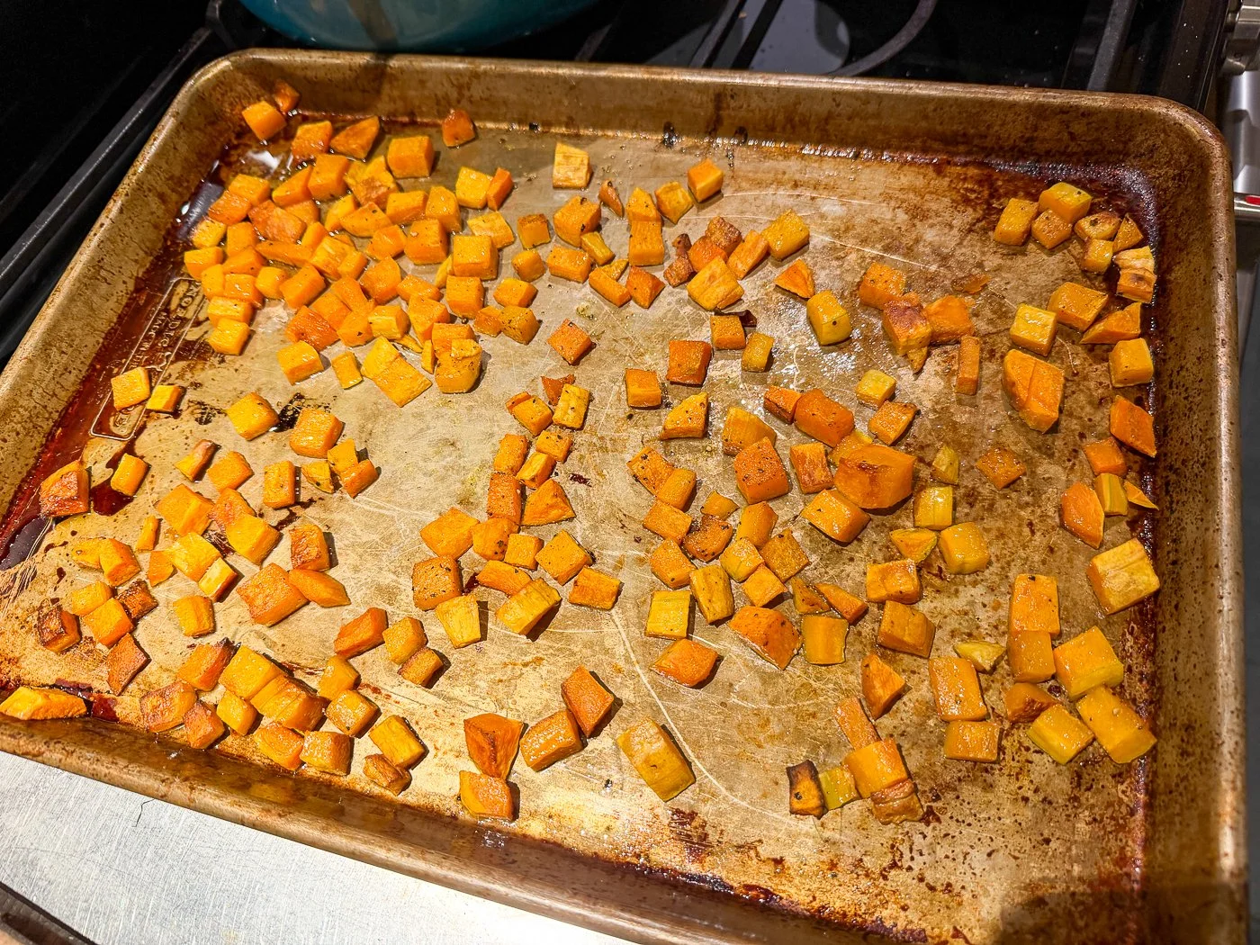 - Preheat the oven to 425. On a cookie sheet, toss the squash with a liberal pour of olive oil (about 1/4 cup), salt and pepper, and spread out. Roast, tossing halfway through, until tender and caramelized but not mushy; 30 to 35 minutes (mine was done closer to 20, probably because I cut the squash a little smaller).