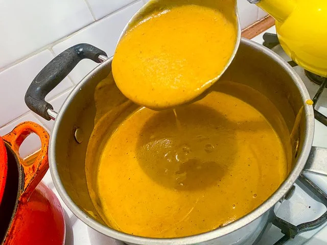 After blending for a few minutes, I strained (cooking with love!), then added back to the pot.