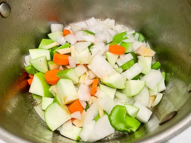 To be kind to myself, I used that same pot (one less dish to clean), now emptied, melted some butter in it with a splash of olive oil and added chopped onion, carrot, celery, a green apple, and a healthy amount of ginger.