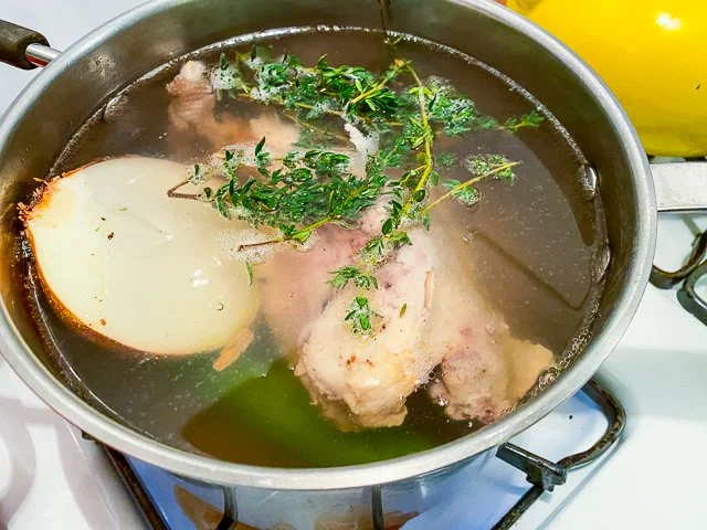 It’s a great lesson in never throwing away your leftover roasted chicken carcass. Another quick note: the less water you use to make the stock, the more concentrated it’ll be. So a small pot, in this situation, is ideal.