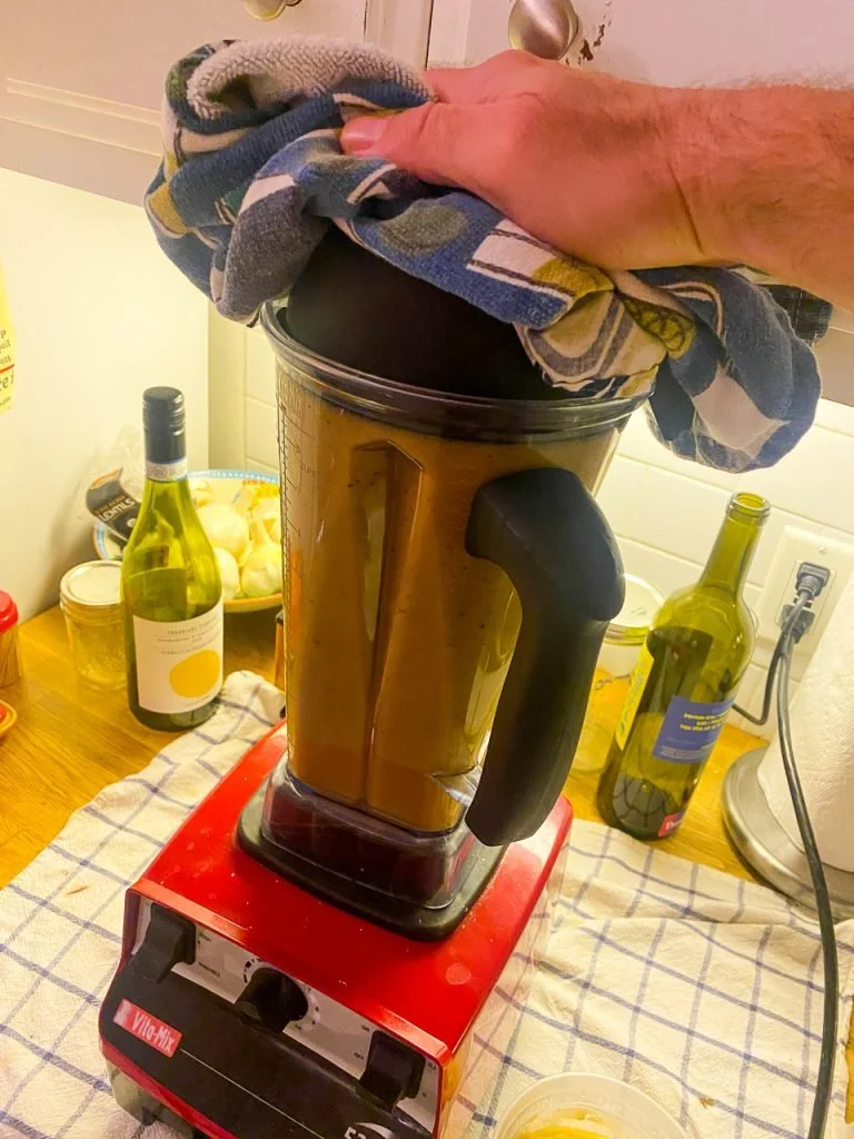 I probably filled the blender too much, but I was careful to start it slowly, keeping a kitchen towel over the top so the whole thing wouldn’t explode.